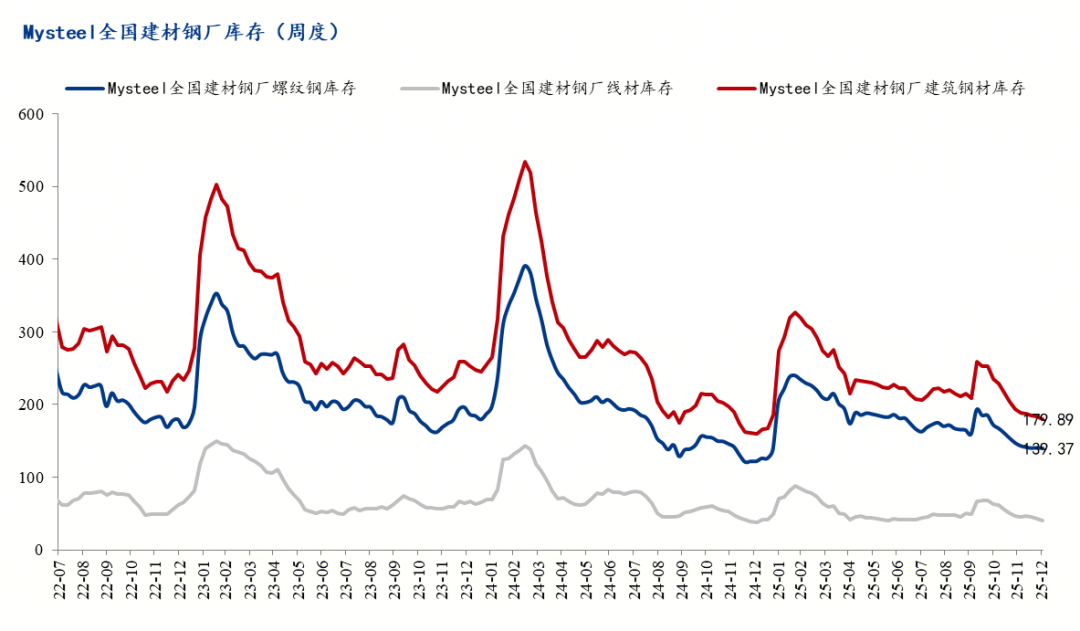 截止12月26日,Mysteel統(tǒng)計建筑鋼材139家鋼廠螺紋鋼庫存總量為140.06萬噸,月環(huán)比下降6.67萬噸,同比增加18.53萬噸;92家鋼廠線材庫存43.32萬噸,月環(huán)比下降3.34萬噸,年同比增加4.1萬噸。