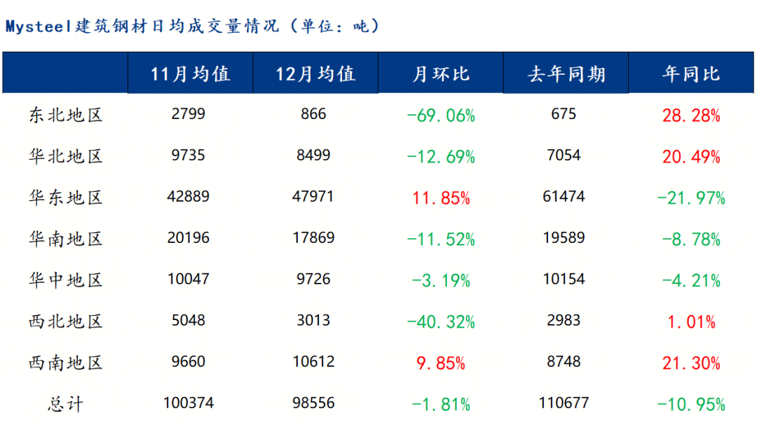 據(jù)調(diào)研,12月份全國樣本貿(mào)易商成交量環(huán)比小幅下降。具體來看,七大區(qū)域成交量除了華東和西南外,其他市場均有一定回落。Mysteel統(tǒng)計12月份全國日均成交量為9.86萬噸,月環(huán)比下降1.81%,年同比下降10.95%。