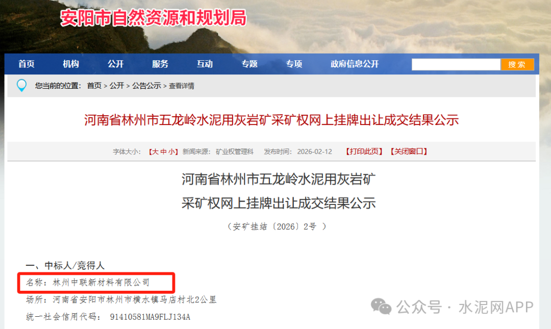 日前,河南安陽市自然資源和規(guī)劃局發(fā)布林州市五龍嶺水泥用灰?guī)r礦采礦權(quán)掛牌出讓成交結(jié)果,安陽中聯(lián)水泥全資子公司林州中聯(lián)新材料有限公司底價1.67億元競得該礦權(quán)。