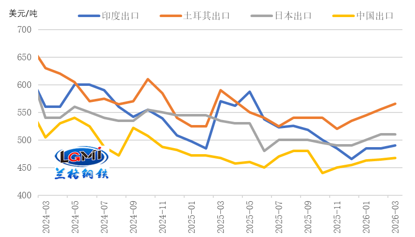 盡管出口面臨多重壓力,我國鋼材的國際價(jià)格競爭力并未減弱。近期國內(nèi)出口報(bào)價(jià)小幅上調(diào),主要出口國報(bào)價(jià)亦同步上行,我國鋼材仍保持明顯價(jià)差優(yōu)勢。據(jù)蘭格鋼鐵研究中心監(jiān)測數(shù)據(jù),截至2026年3月10日,中國熱軋卷板出口報(bào)價(jià)(FOB)為467美元/噸,顯著低于印度(490美元/噸)、日本(510美元/噸)和土耳其(566美元/噸)等主要競爭對(duì)手,價(jià)差分別達(dá)23美元/噸、43美元/噸和99美元/噸,強(qiáng)勁的價(jià)格優(yōu)勢為出口規(guī)模提供堅(jiān)實(shí)支撐(詳見圖2)。