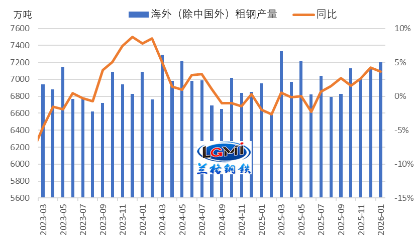 全球粗鋼供給端穩(wěn)步擴(kuò)張,持續(xù)分流我國鋼材出口份額。世界鋼協(xié)數(shù)據(jù)顯示,2026年1月,全球69個(gè)納入統(tǒng)計(jì)的國家和地區(qū)粗鋼產(chǎn)量為1.473億噸,同比下降6.5%。