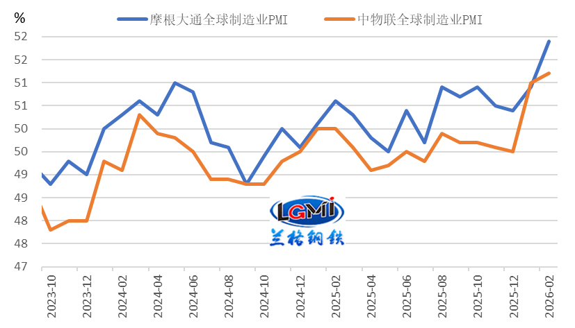 全球制造業(yè)雖處于擴(kuò)張區(qū)間,但復(fù)蘇動(dòng)能不足,對(duì)鋼材外需拉動(dòng)有限。2026年2月,中國物流與采購聯(lián)合會(huì)全球制造業(yè)PMI為51.2%,環(huán)比提升0.2個(gè)百分點(diǎn);摩根大通全球制造業(yè)PMI為51.9%,環(huán)比回升1.0個(gè)百分點(diǎn)(詳見圖4)。兩大指數(shù)雖位于榮枯線以上,但復(fù)蘇基礎(chǔ)薄弱,外需整體景氣度偏低,難以對(duì)我國出口形成強(qiáng)勁拉動(dòng)。