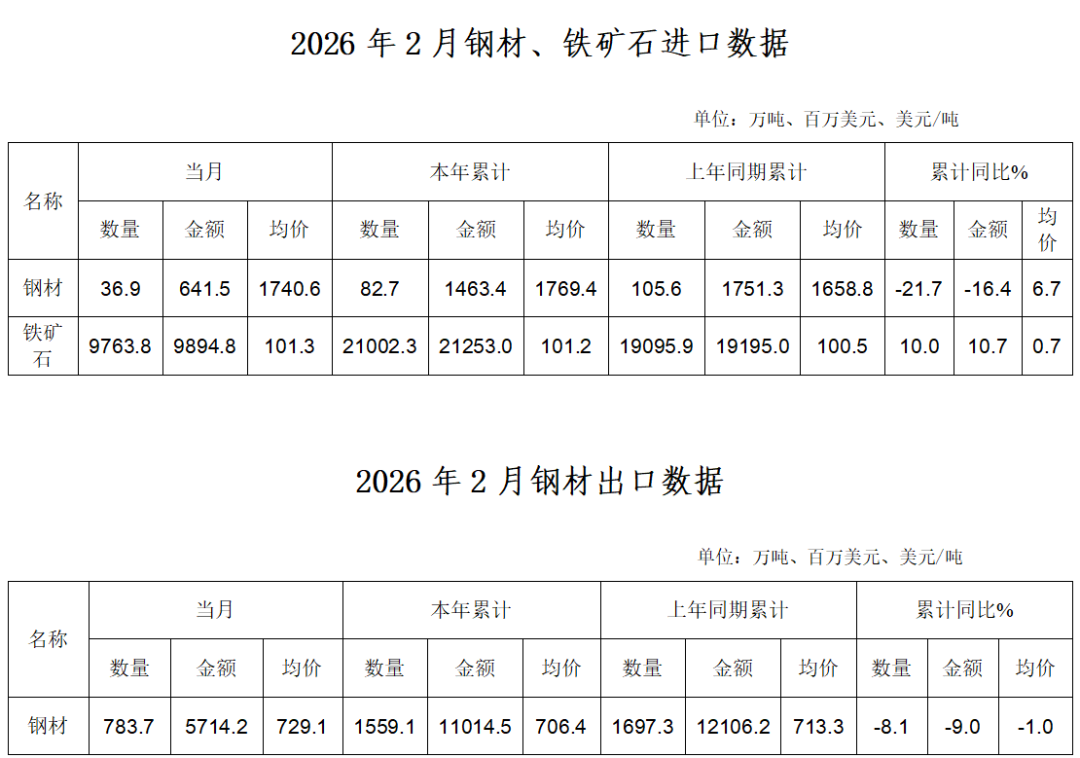 根據(jù)海關(guān)統(tǒng)計快訊數(shù)據(jù),2026年2月,我國進口鋼材36.9萬噸,環(huán)比減少9.0萬噸、降幅19.6%;均價1470.6美元/噸,環(huán)比下跌52.0美元/噸、跌幅2.9%。1-2月累計進口鋼材82.7萬噸,同比減少22.9萬噸、降幅21.7%。