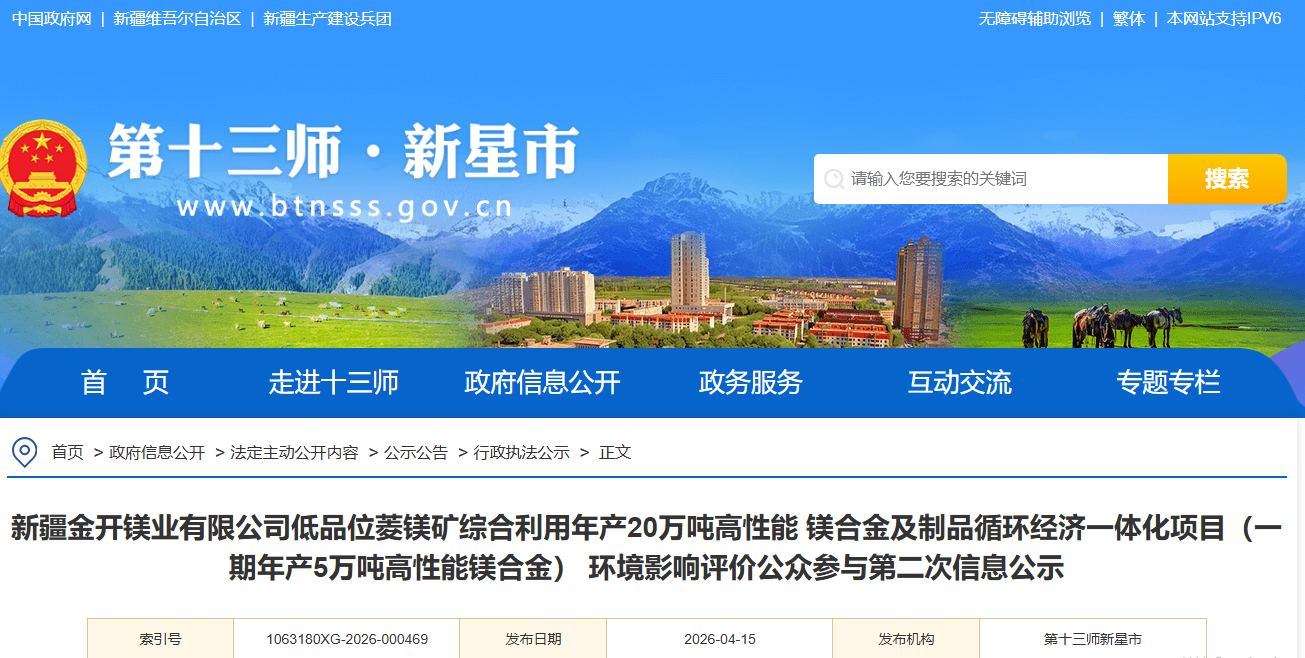 我公司委托新疆辰光啟航環(huán)保技術(shù)有限公司承擔(dān)了“新疆金開鎂業(yè)有限公司低品位菱鎂礦綜合利用年產(chǎn)20萬噸高性能鎂合金及制品循環(huán)經(jīng)濟一體化項目(一期年產(chǎn)5萬噸高性能鎂合金)”的環(huán)境影響評價工作?,F(xiàn)環(huán)境影響評價單位編制完成了《新疆金開鎂業(yè)有限公司低品位菱鎂礦綜合利用年產(chǎn)20萬噸高性能鎂合金及制品循環(huán)經(jīng)濟一體化項目(一期年產(chǎn)5萬噸高性能鎂合金)環(huán)境影響報告書》(征求意見稿),根據(jù)《中華人民共和國環(huán)境影響評價法》《環(huán)境影響評價公眾參與辦法》(生態(tài)環(huán)境部令第4號)等法律法規(guī)及相關(guān)規(guī)定,現(xiàn)對該項目進(jìn)行公眾參與第二次信息公開,請社會公眾對該報告提出意見和建議。公示材料如下: