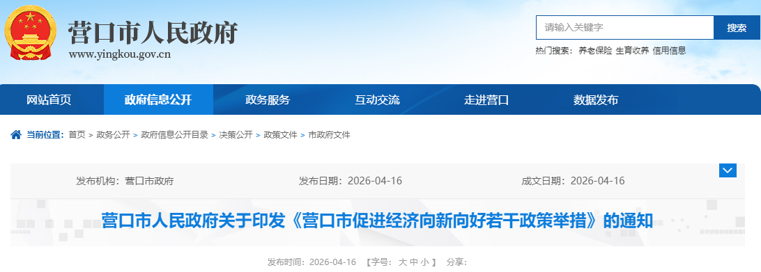 《營口市促進經(jīng)濟向新向好若干政策舉措》業(yè)經(jīng)2026年4月12日第十七屆市政府第106次常務(wù)會議審議通過,現(xiàn)予印發(fā),請認真貫徹執(zhí)行。