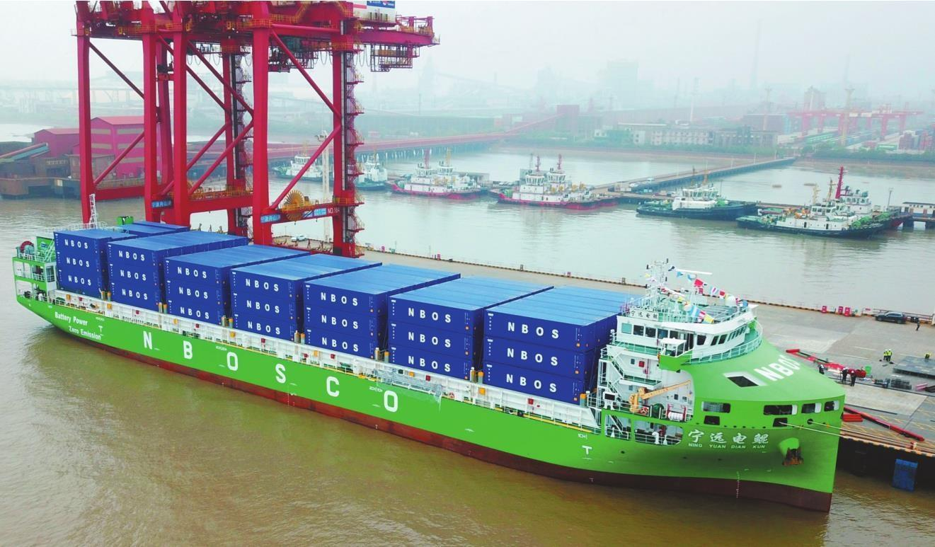 4月15日,純電動智能集裝箱海船“寧遠(yuǎn)電鯤”輪停泊在寧波舟山港北侖港區(qū),準(zhǔn)備啟航(無人機(jī)照片)。4月15日,全球最大、國內(nèi)首艘萬噸級純電動智能集裝箱海船“寧遠(yuǎn)電鯤”輪啟航,標(biāo)志著該船正式投入商業(yè)航線運(yùn)營?!皩庍h(yuǎn)電鯤”輪由寧波遠(yuǎn)洋運(yùn)輸股份有限公司打造,總長127.8米、寬21.6米,可裝載742標(biāo)準(zhǔn)箱貨物。船舶采用10個標(biāo)準(zhǔn)化箱式電池作為核心動力,總儲電量約2萬度,該船投用后,預(yù)計(jì)每年可節(jié)約燃油580噸,減少二氧化碳排放量超1400噸。