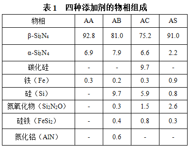 在本研究中,采用四種不同的添加劑,分別標記為AS、AA、AB和AC,其中AS為常規(guī)添加劑,用作對比;AA、AB和AC為三種特種添加劑。利用MasterSizer 2000粒度分析儀對添加劑的粒度分布(PSD)進行了分析,結果如圖1所示。從圖1可以看出,常規(guī)添加劑(AS)的粒度明顯更細,其d10、d50和d90值均低于特殊添加劑。在這些特殊添加劑中,添加劑AC的粒度分布最寬,表明其粒度范圍更廣。此外,利用XRD分析了四種添加劑的相組成,結果如表1所示。與其他添加劑相比,添加劑AA含有相對較高的氮化硅(Si3N4);除了氮化硅外,添加劑AB還含有較高含量的金屬硅(Si),添加劑AC還含有一定量的金屬硅和碳化硅(SiC)。